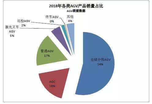 從 2018 年不同品類的 AGV 產品銷量來看,普通 AGV 銷售占比 17%,銷量約為 5000 臺;AGC 產品占比 18%,銷量為 5400 臺,較 2017 年降低 12%,已經出現連續三年下跌情況。倉儲分揀 AGV(包含了工廠倉儲分揀)近 16000 臺,占比 54%,較去年增長 27%,連續三年出現上漲;激光叉車 AGV 銷售約為 1500 臺,占比約為 5%,較去年增長 45%。停車 AGV2018年銷量約為 100 臺。巡檢 AGV 出貨超過 500 臺,其他類 AGV 約為 1000 余臺。