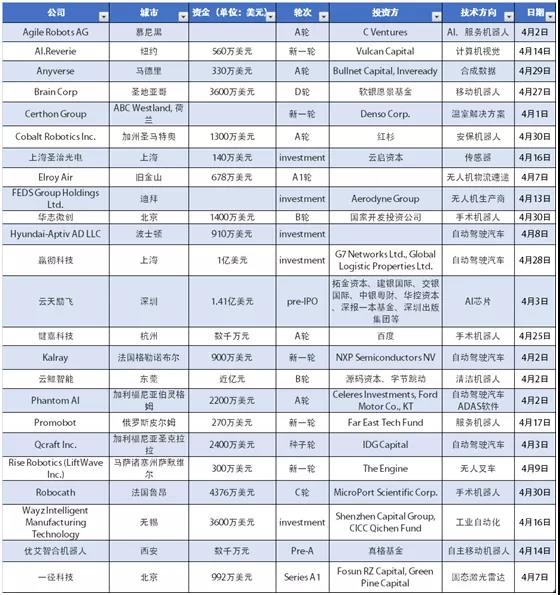 下表是4月份全球機器人產業投融資交易匯總。